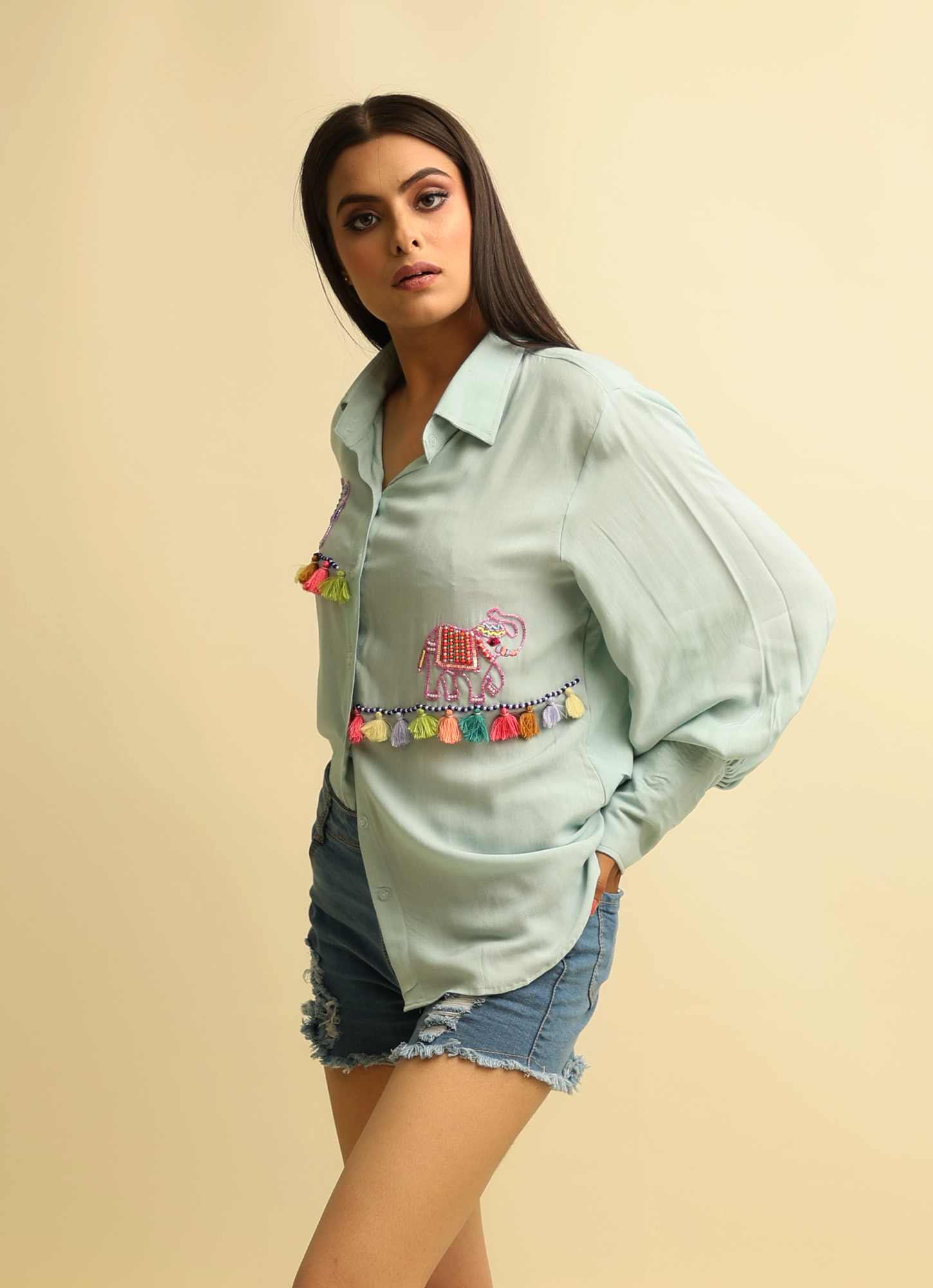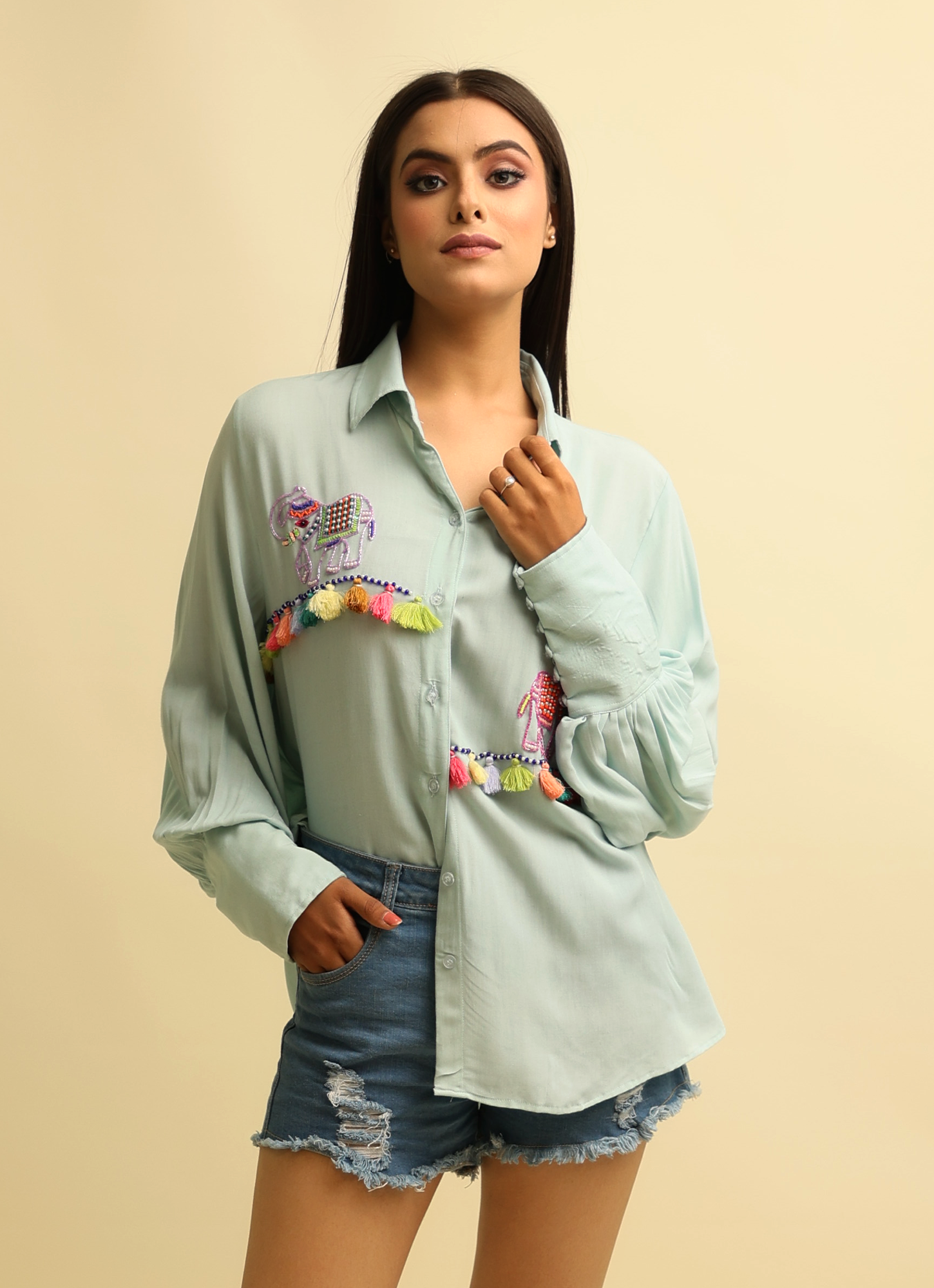 Introducing Aisha by Bablee Bee – a timeless piece that reflects elegance and craftsmanship. This hand-embroidered shirt is thoughtfully designed with intricate detailing and charming tassels that add a touch of uniqueness to your style. Crafted from soft and breathable cotton rayon, Aisha offers both comfort and sophistication, making it a perfect choice for any occasion – be it a casual day out or a festive gathering.
