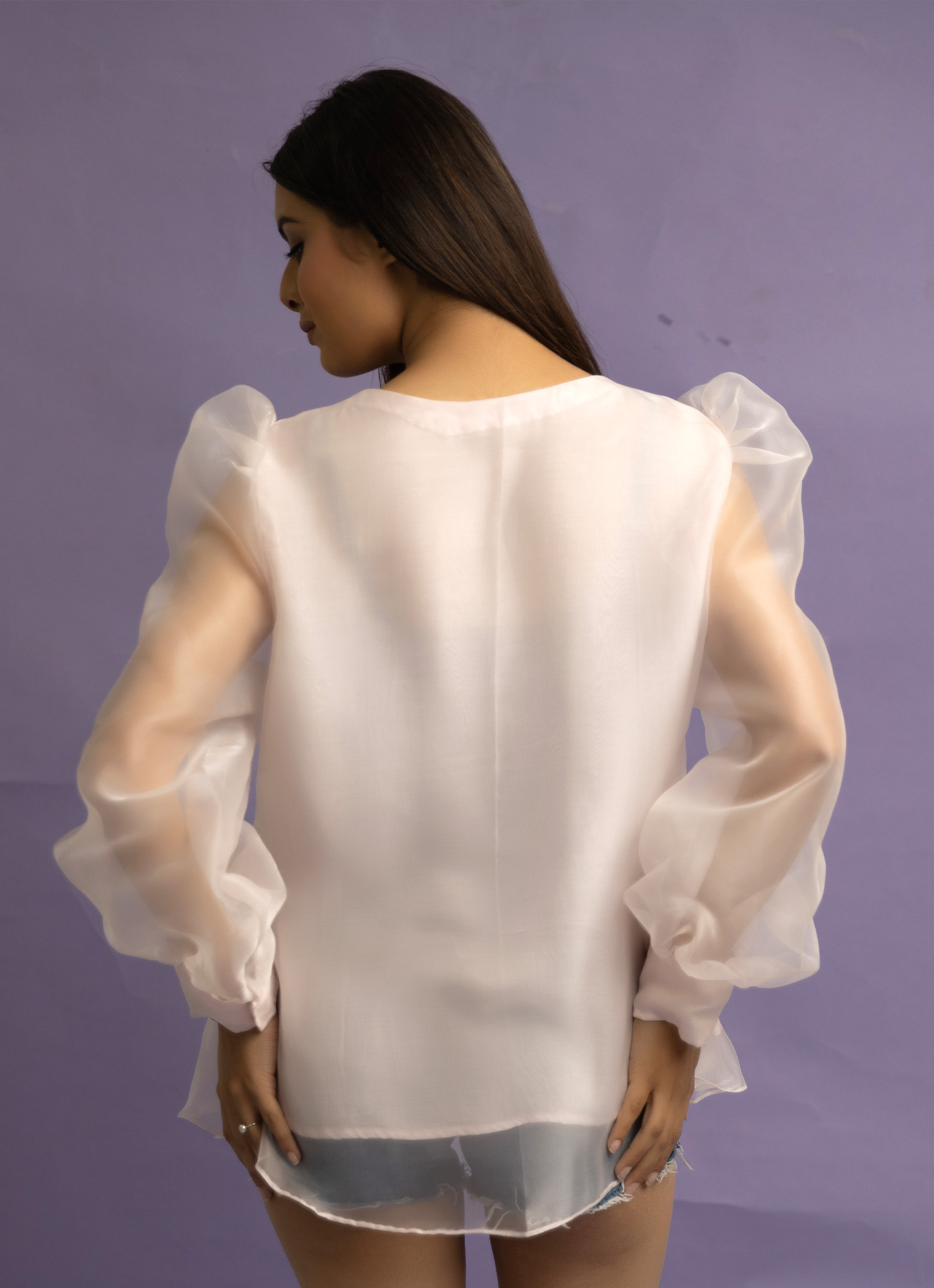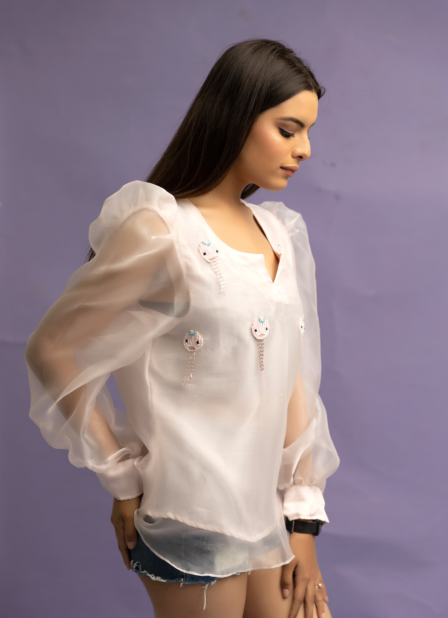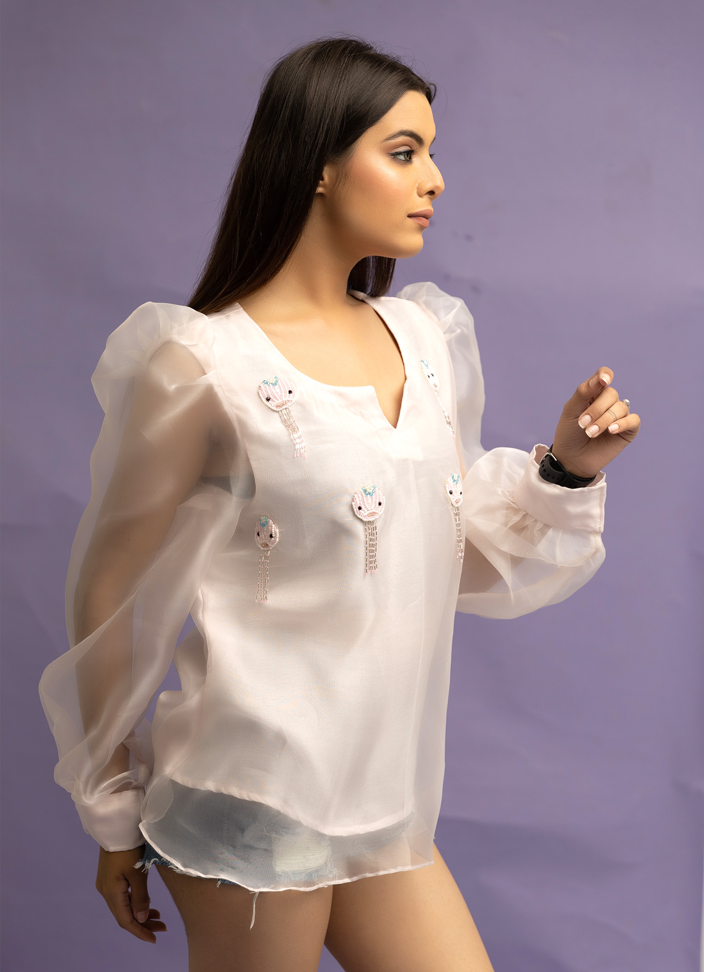 Delicate, dreamy, and full of sparkle — Sia by Bablee Bee is a stunning statement piece that embodies elegance and grace. Crafted from sheer and flowy glass organza, this design features intricate hand-embroidered detailing with glass beads, pearls, crystals, and more, giving it a radiant and luxurious finish.
