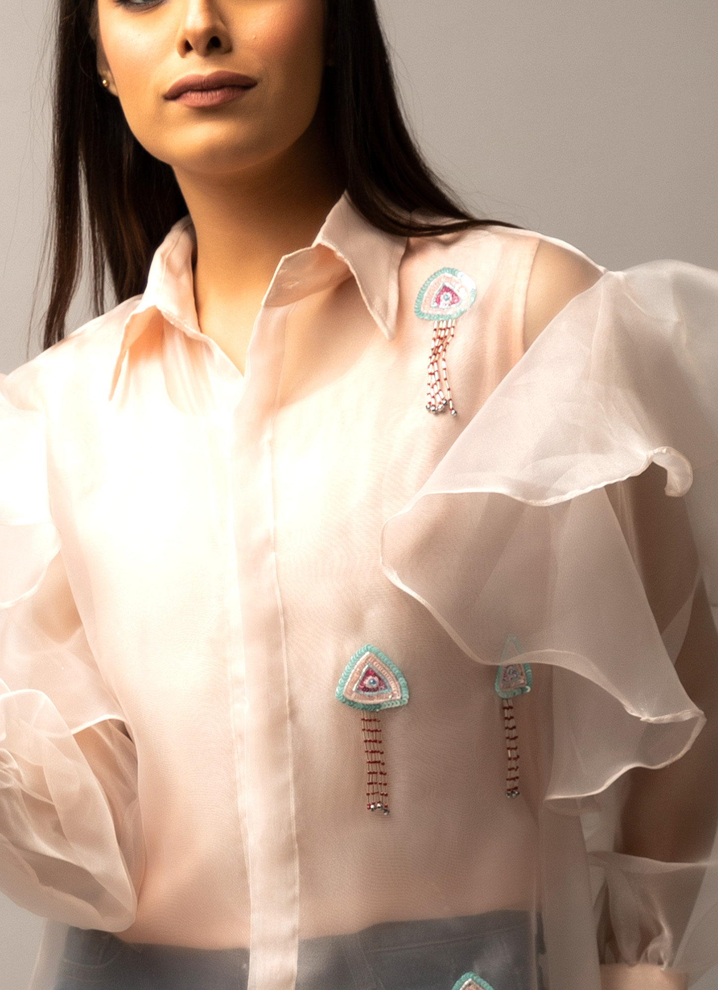 Make a statement with Vibe Check by Bablee Bee – a stunning creation that blends sophistication with sparkle. Crafted from sheer and luxurious glass organza, this piece is adorned with exquisite hand-embroidered detailing featuring glass beads, pearls, crystals, and more.